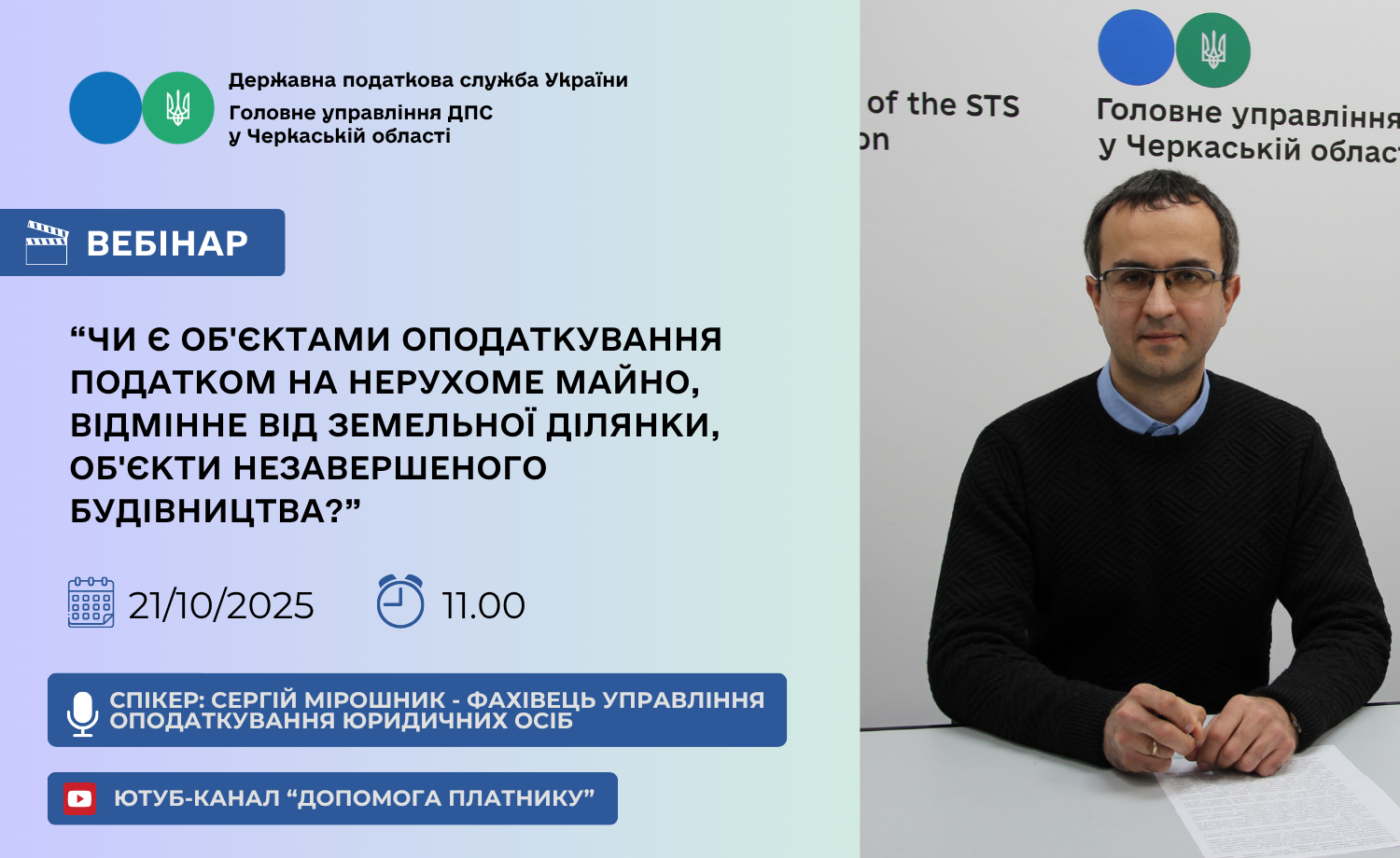 Шановні платники! 21/10/2025 об 11.00 на ютуб-каналі «Допомога платнику» Сергій Мірошник, фахівець управління оподаткування юридичних осіб ГУ ДПС у Черкаській області, надасть вичерпне роз'яснення щодо оподаткування об'єктів незавершеного будівництва податком на нерухоме майно, відмінне від земельної ділянки.