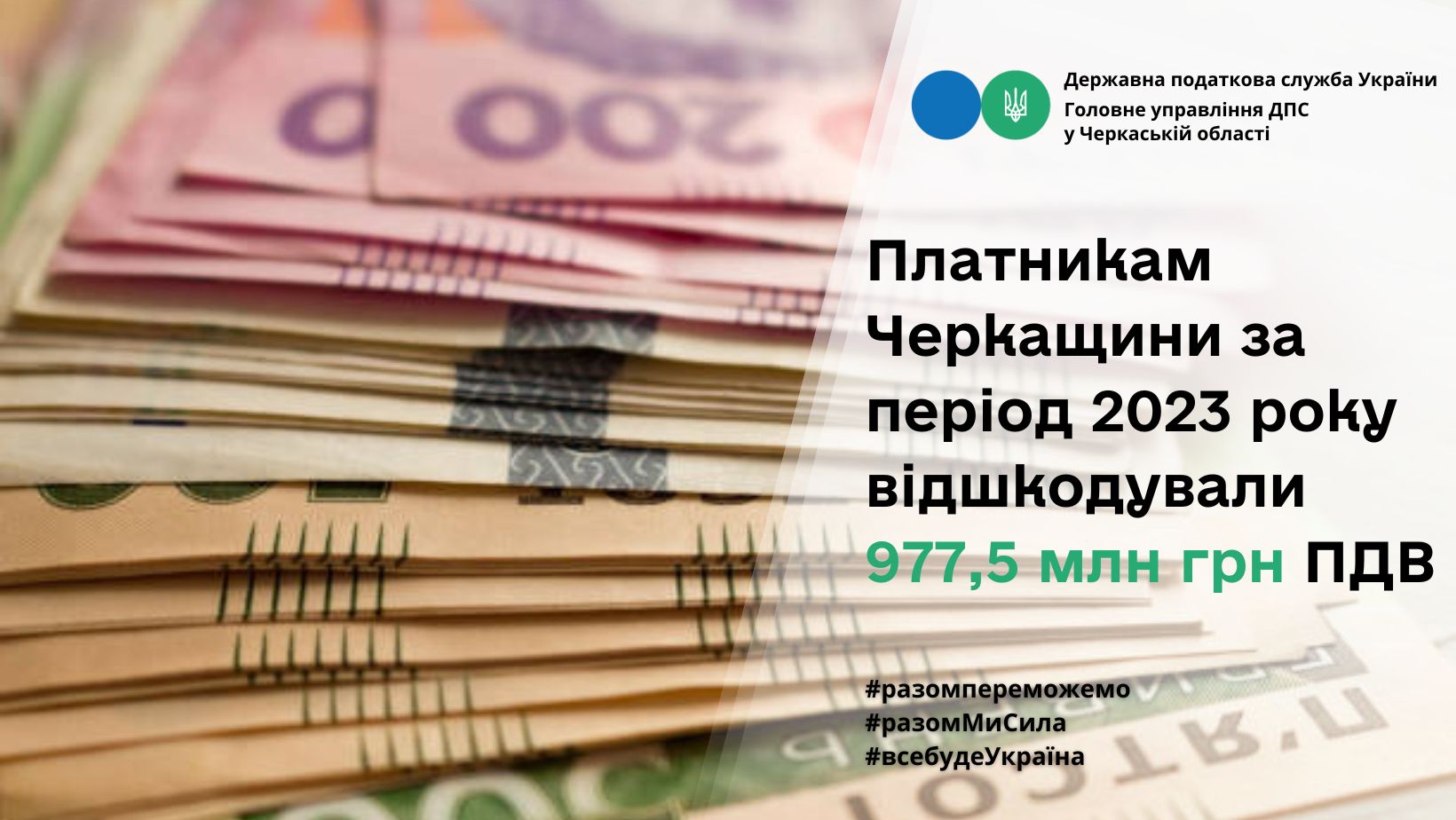 У цілому в січні-серпні 2023 року платники Черкаської області отримали бюджетне відшкодування ПДВ грошовими коштами на загальну суму 977,5 млн грн, за аналогічний період 2022 року бюджетне відшкодування було отримано на загальну суму 329,6 млн грн.