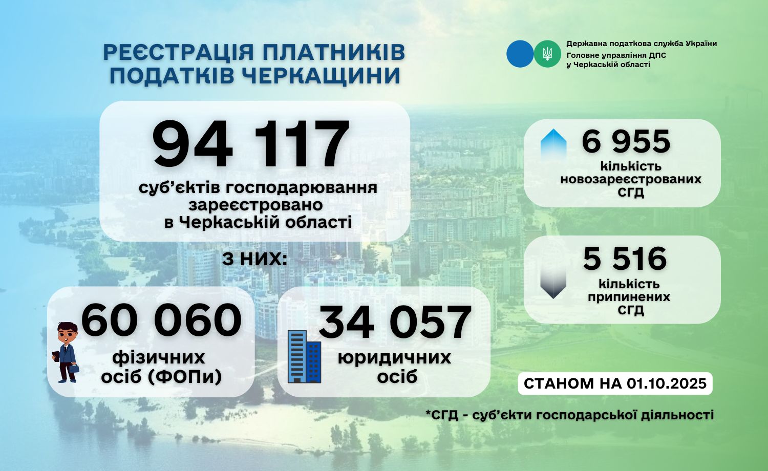Головне управління ДПС у Черкаській області інформує, що станом на 01.10.2025 на Черкащині зареєстровано 94 117 суб’єктів господарювання, із них: 60 060 фізичних осіб-підприємців та 34 057 юридичних осіб.