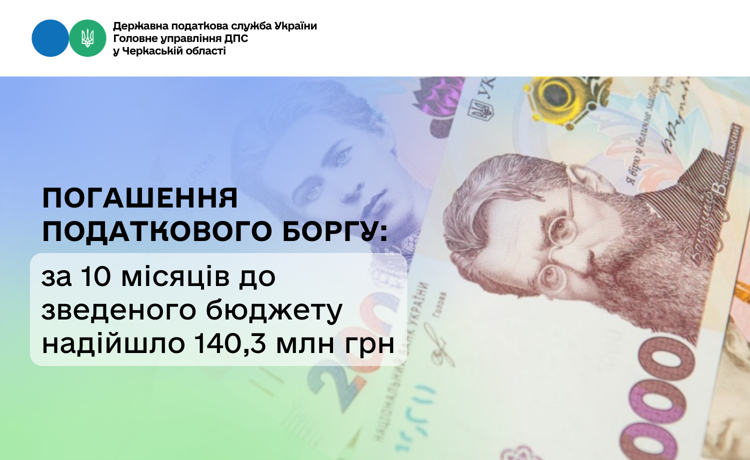 За підсумками січня-жовтня 2025 року, завдяки заходам Головного управління ДПС у Черкаській області, спрямованим на погашення податкового боргу, до зведеного бюджету надійшло 140,3 млн гривень. 70,6 млн гривень з цієї суми поповнили державний бюджет.