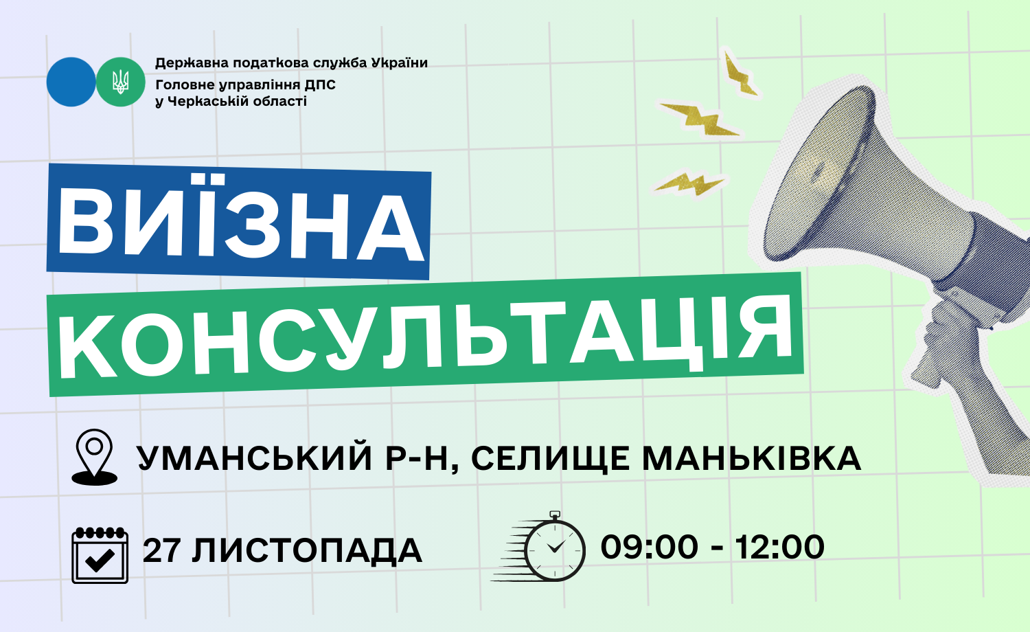 27 листопада фахівці Уманської державної податкової інспекції проведуть виїзну консультацію для мешканців та підприємців Маньківської селищної територіальної громади. Ви зможете отримати професійні роз'яснення та відповіді на всі актуальні питання безпосередньо у вашому населеному пункті.