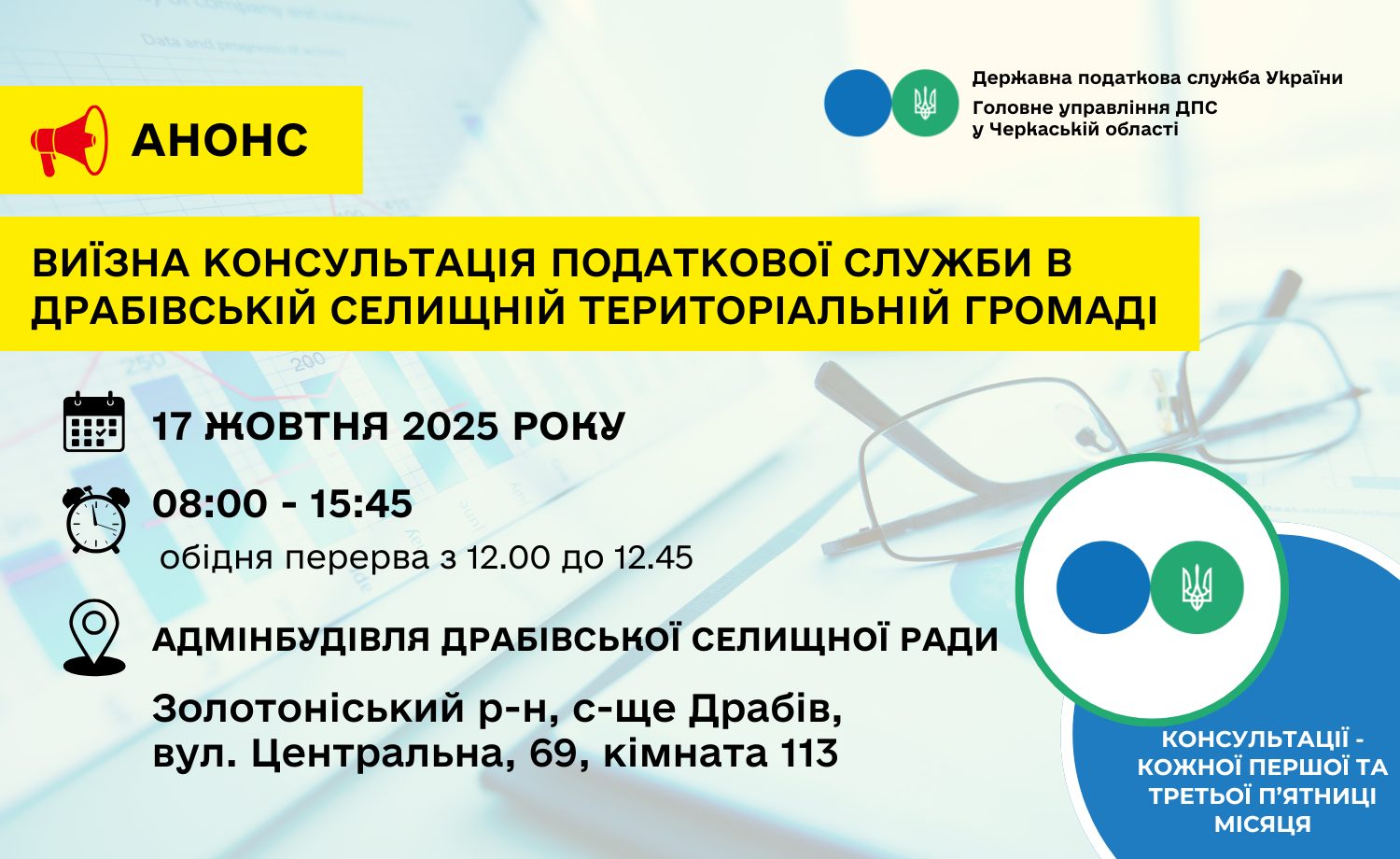 Анонс: 17 жовтня – виїзна консультація податкової служби в Драбівській громаді