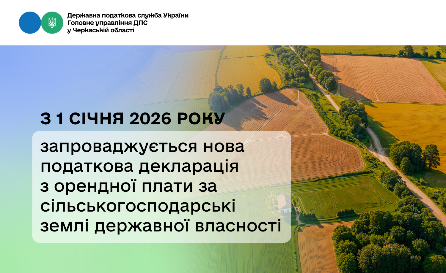 Очільниця Головного управління ДПС у Черкаській області Тетяна Харьковська повідомляє, що з 1 січня 2026 року запроваджується нова форма податкової декларації з орендної плати для земельних ділянок сільськогосподарського призначення державної власності.