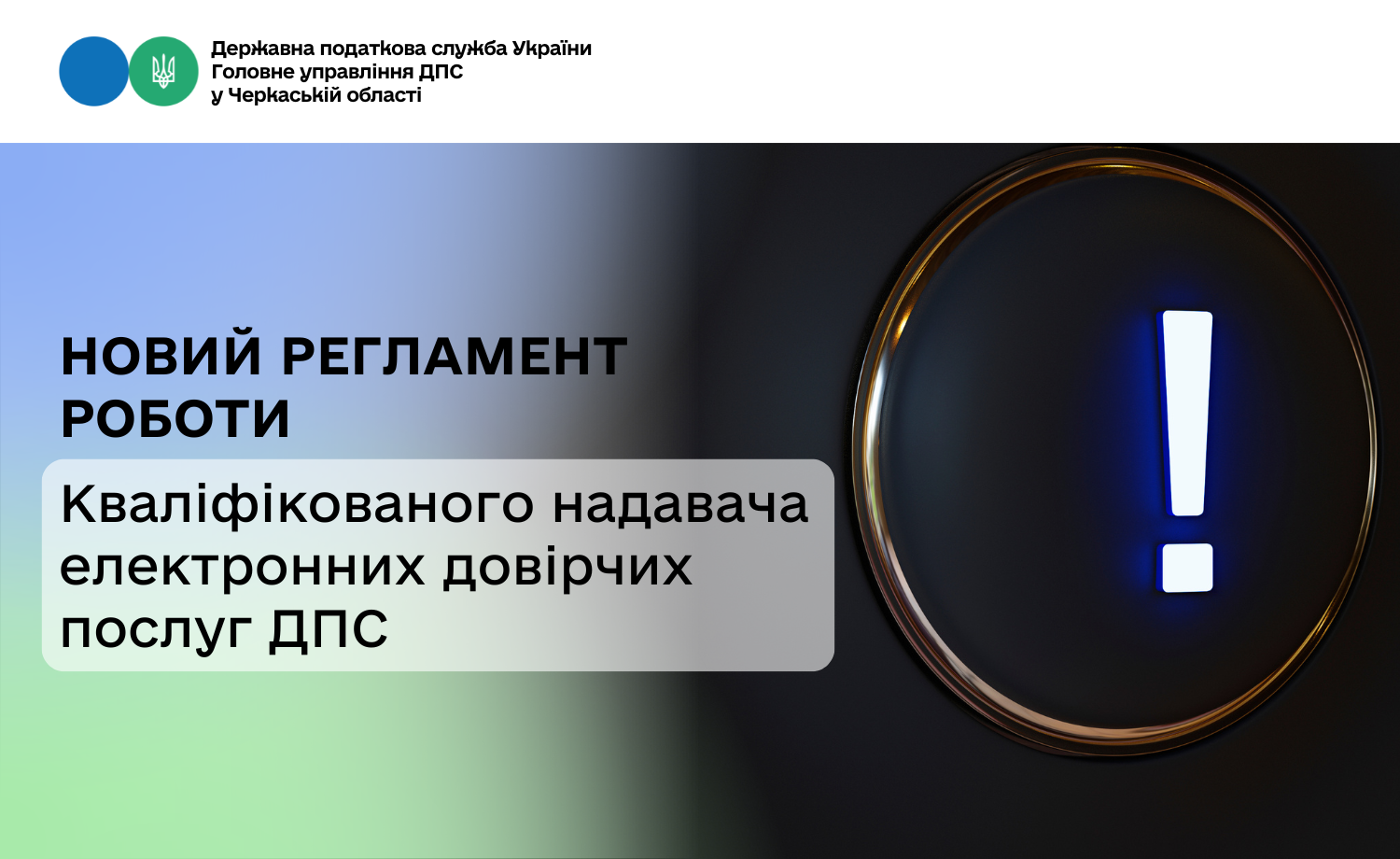 Повідомляємо, що 24.09.2025 на вебсайті ca.tax.gov.ua (далі – Сайт) опубліковано новий Регламент роботи Кваліфікованого надавача електронних довірчих послуг Державної податкової служби України, котрий набрав чинності через 10 днів з дня опублікування. Також наказом ДПС від 04.09.2025 № 897 «Про внесення змін до наказу ДПС від 21.12.2022 № 930» внесено зміни до Договору про надання кваліфікованих електронних довірчих послуг та затверджено нові форми реєстраційних документів: