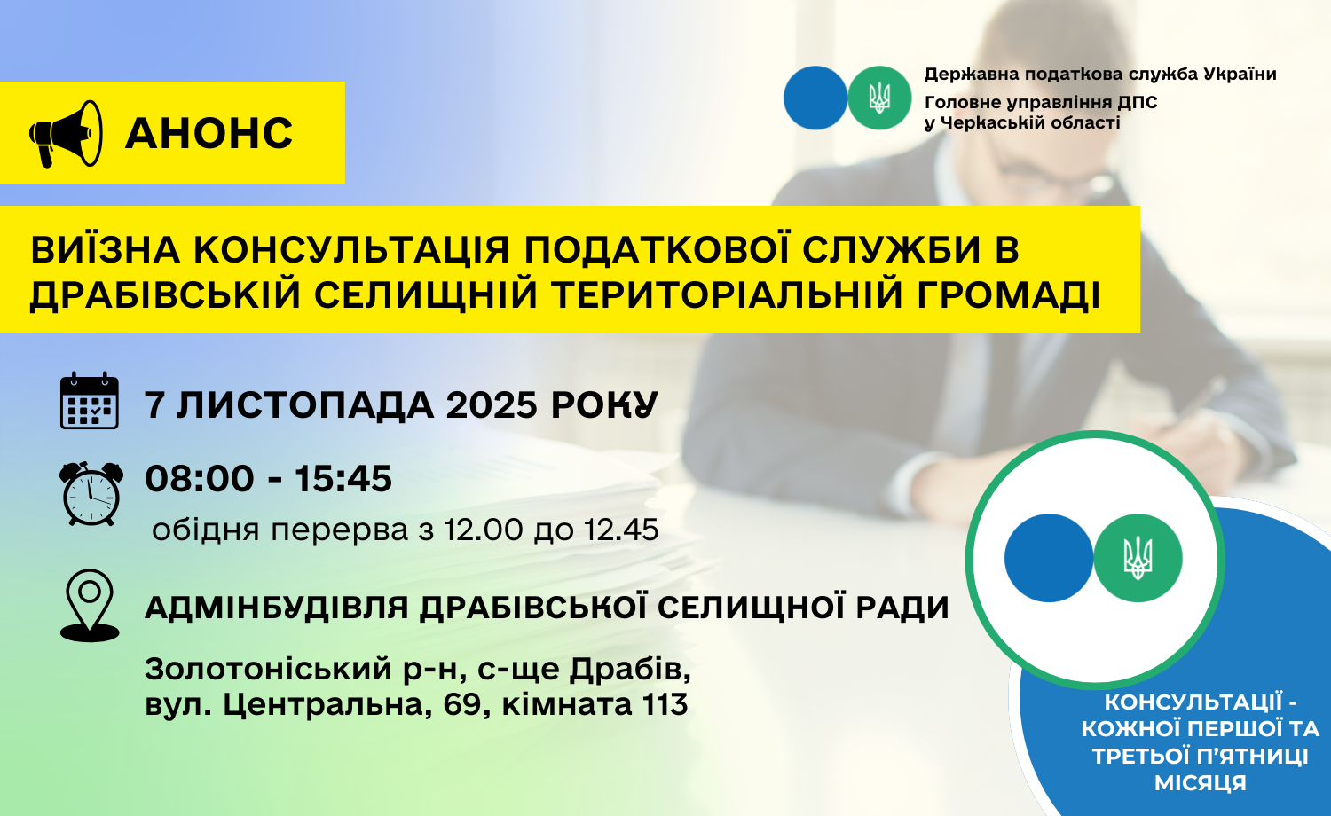 Місце: Золотоніський р-н, с-ще Драбів, вул. Центральна, 69, кімната 113 (адмінбудівля Драбівської селищної ради).