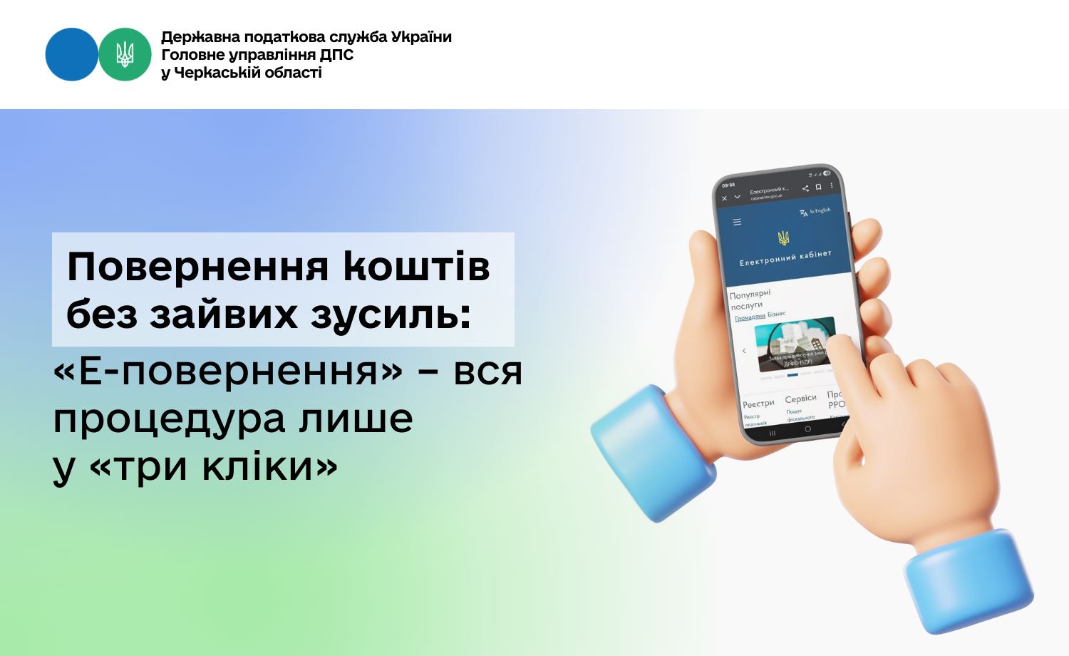 Очільниця Головного управління ДПС у Черкаській області Тетяна Харьковська нагадує, що для спрощення процедури повернення помилково та/або надміру сплачених платежів діє сервіс «Е-повернення».