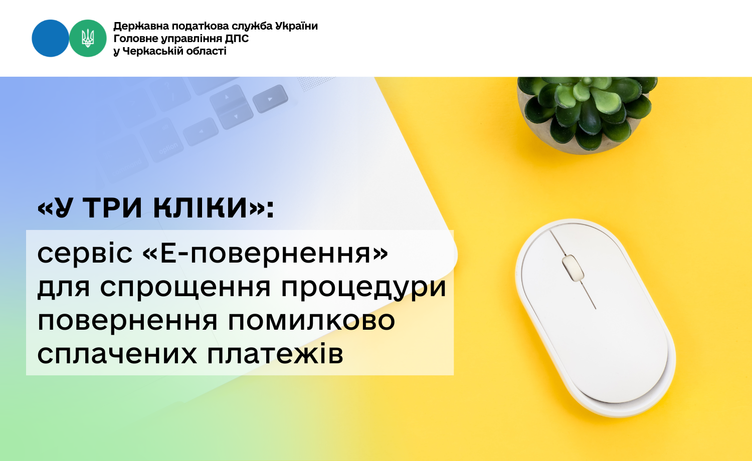 Головне управління ДПС у Черкаській області повідомляє, що для спрощення процедури повернення помилково та/або надміру сплачених платежів діє сервіс «Е-повернення».