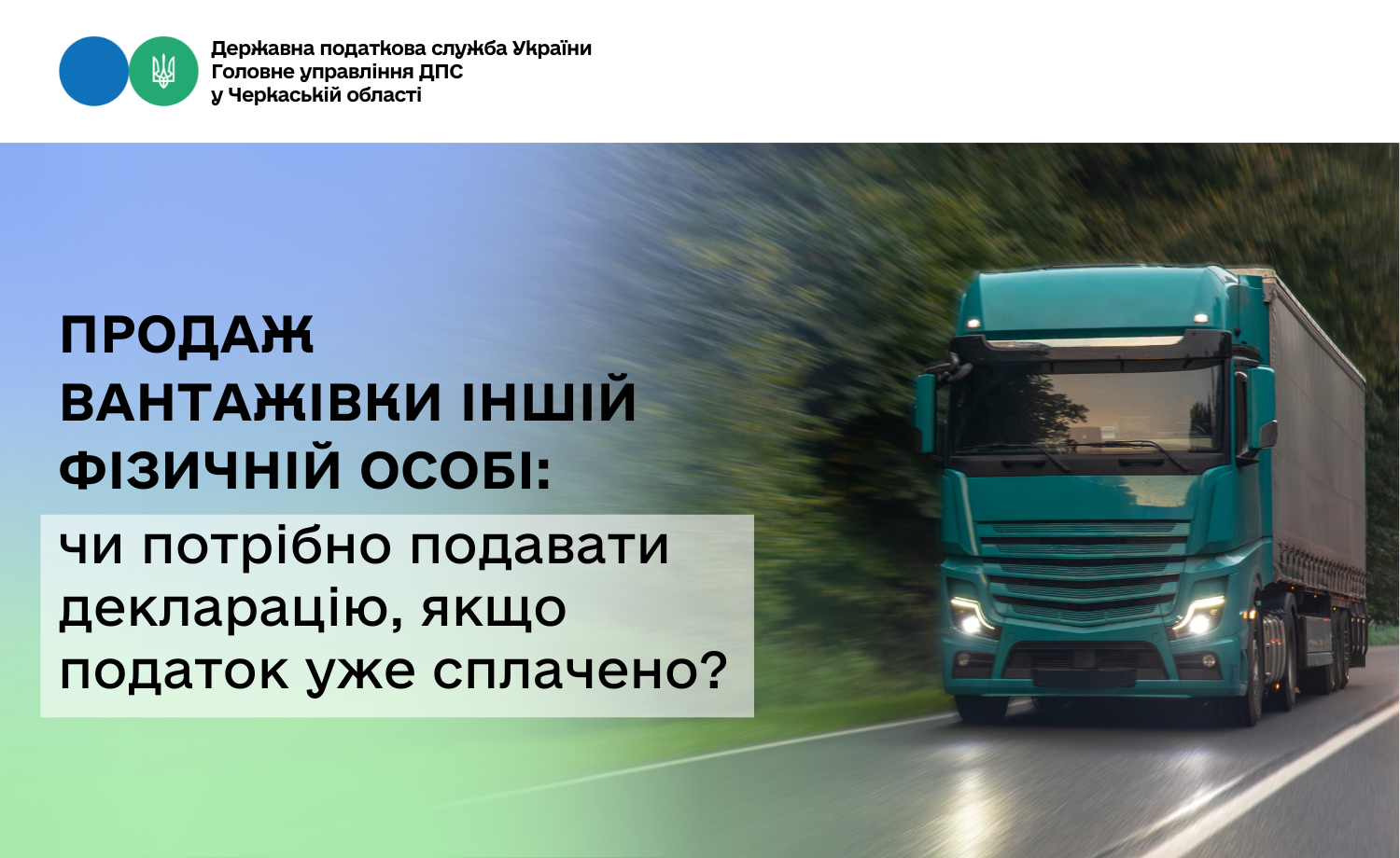 Враховуючи викладене, фізична особа – резидент (продавець) під час оформлення договору відчуження іншій фізичній особі рухомого майна у вигляді вантажного автомобіля в органі, який здійснює реєстрацію (перереєстрацію) транспортних засобів або через товарну біржу, зобов’язана самостійно сплатити до бюджету за своєю податковою адресою податок на доходи фізичних осіб з доходу від продажу такого майна та подати Декларацію за відповідний звітний рік до 01 травня року, що настає за звітним.