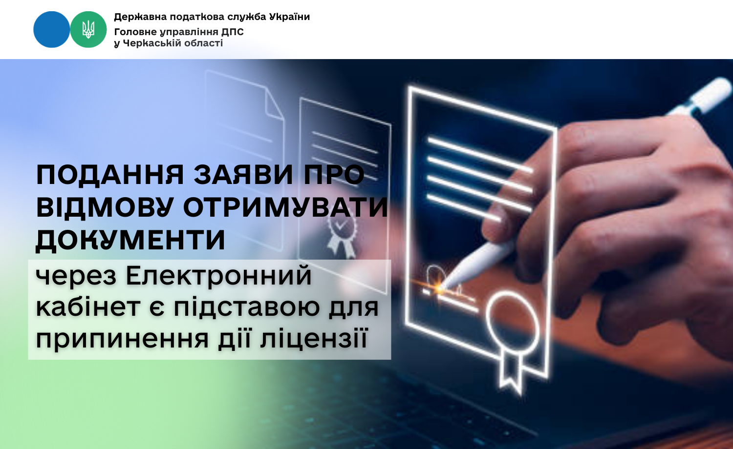 Згідно з ч. 42 ст. 46 Закону №3817 підставою для прийняття органом ліцензування рішення про припинення дії ліцензії на право провадження відповідного виду господарської діяльності є, зокрема, контролюючим органом прийнято заяву про відмову отримувати документи через електронний кабінет.