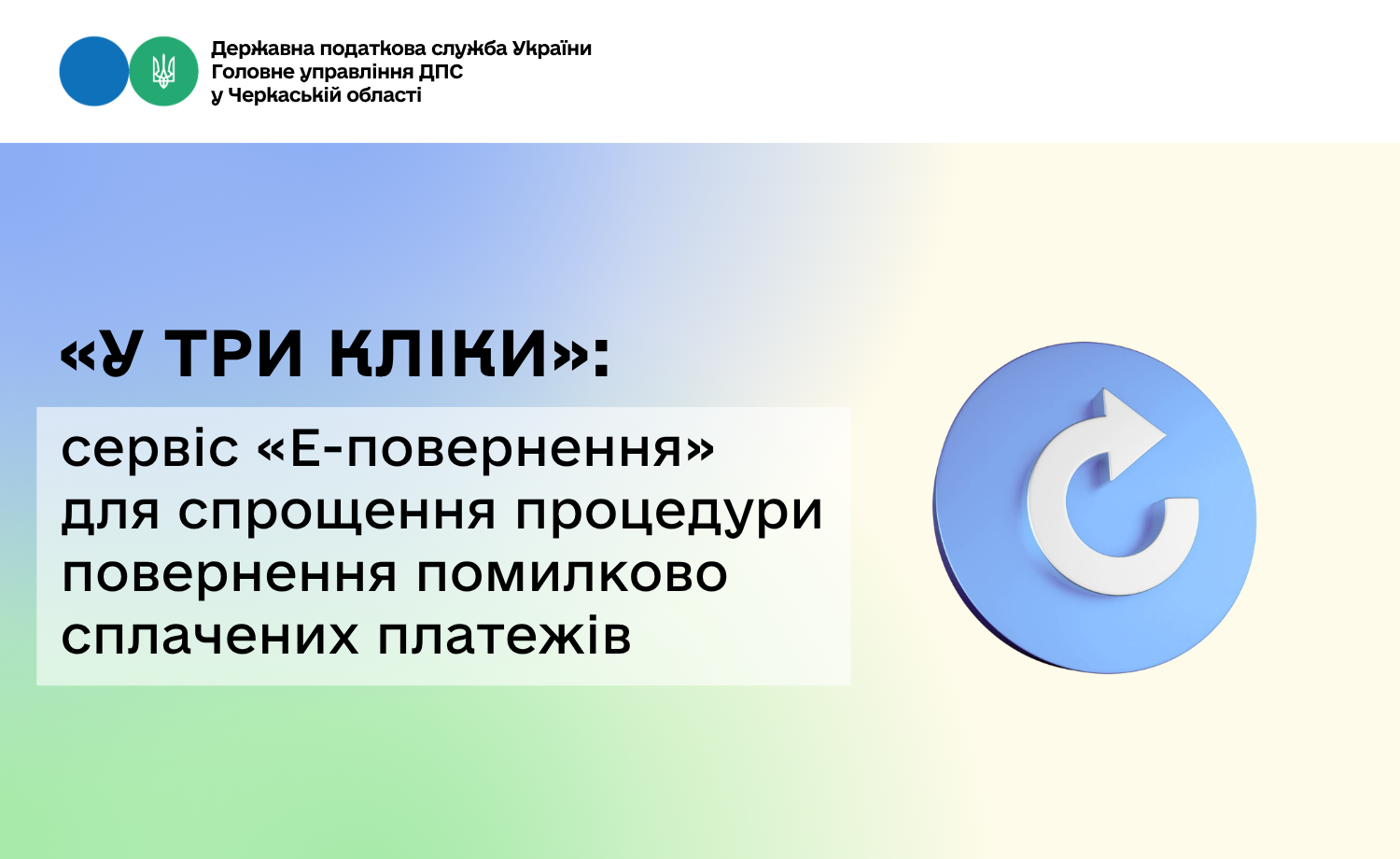 Головне управління ДПС у Черкаській області повідомляє, що для спрощення процедури повернення помилково та/або надміру сплачених платежів діє сервіс «Е-повернення».