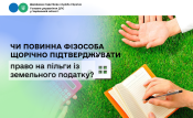 Отже, якщо фізична особа є власником однієї земельної ділянки або декількох ділянок з різними видами використання та має право на пільгу по земельному податку, то для отримання пільги їй необхідно звернутися (з урахуванням терміну давності) до контролюючого органу за своїм місцем реєстрації або за місцем знаходження земельних ділянок із оригіналом документа або належним чином засвідченої копії документа, що посвідчує право на пільгу.