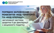 У графі «Код території» розділу Д та Додатка 5 до Декларації зазначається код згідно з третім або додатковим (за наявності) рівнем Кодифікатора адміністративно-територіальних одиниць та територій територіальних громад, затвердженим наказом Міністерства розвитку громад та територій України від 26.11.2020 № 290 (у редакції наказу Міністерства розвитку громад та територій України від 1201.2021 № 3) (далі – Код території).