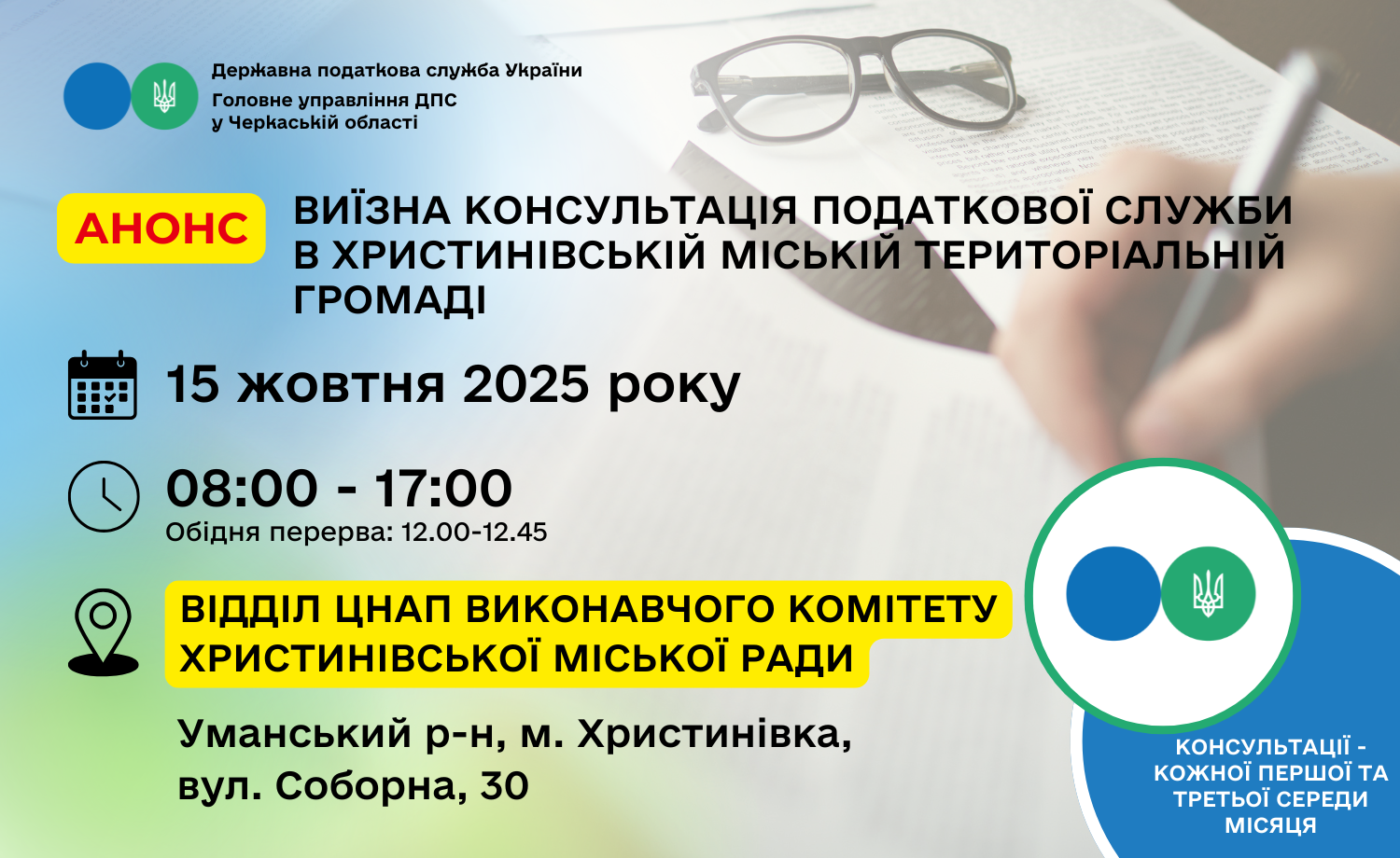 Місце: Відділ ЦНАП виконавчого комітету Христинівської міської ради, Уманський р-н, м. Христинівка, вул. Соборна, 30.